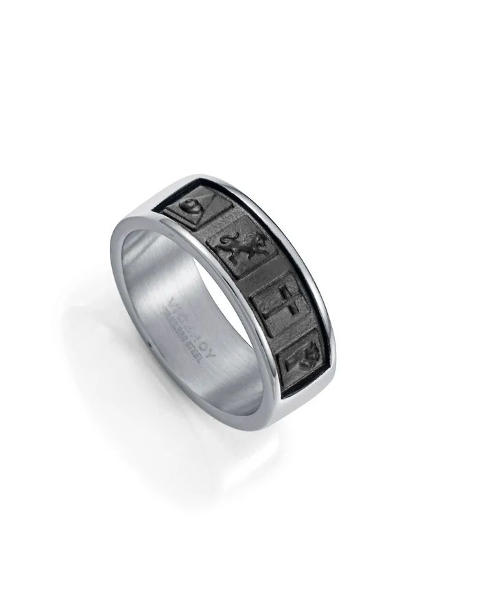 Anillo Acero Bicolor Negro Viceroy Hombre 75423A02610 Tallado. Anillo fabricado en acero bicolor negro inoxidable. Diseño tallado de caballo y otras formas. Tallas 20-22-24-26. Certificado de autenticidad y garantía de calidad en los materiales de fabricación. Ref 75423A02610