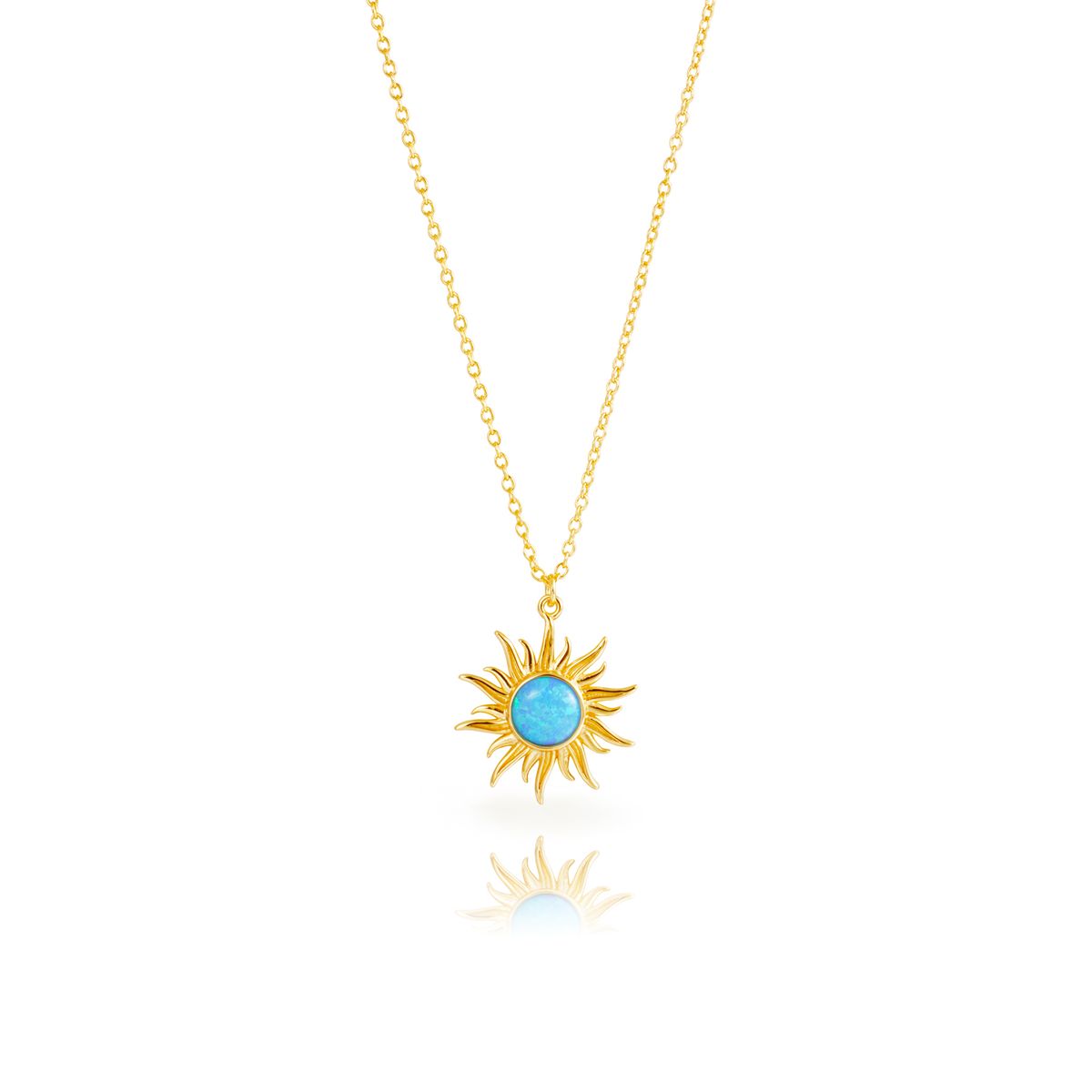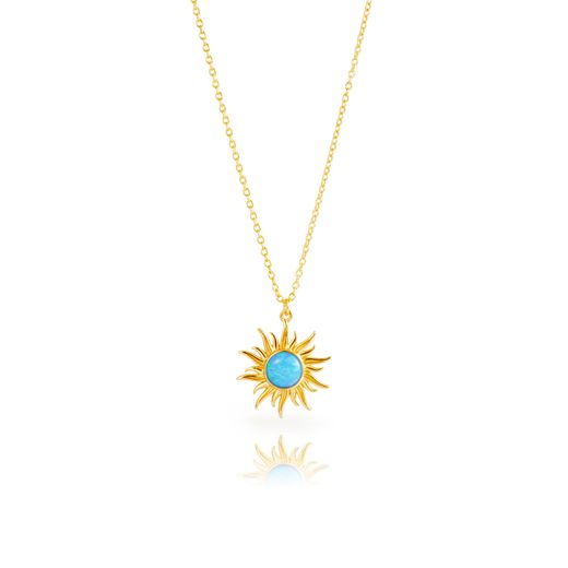 Colgante Plata Dorada 17,5mm COM0155DOOA Sol Piedra Mineral Syn Ópalo Azul. Colgante fabricado en plata de ley 925 bañada en oro de 18kts. Diseño de sol con piedra mineral syn ópalo azul. Peso 2,50gr. Medida 17,5mm. Incluye cadena de 40-47cm. Cierre mosquetón. Certificado de autenticidad y garantía de calidad en los materiales de fabricación. Ref COM0155DOOA