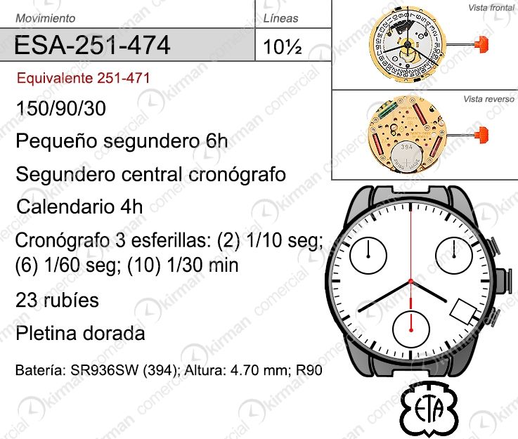 Movimiento Reloj Cuarzo ETA ESA-251-474 Calendario 4H. Movimiento de cuarzo con 23 rubíes Pletina Dorada. Diseño de ESA-251-474 con calendario a las 4H Segundero desplazado a las 6H, Segundero Central Cronógrafo, Calendario a las 4H, Con 3 esferas indicadoras de Chrono 2H de 1/10 seg., 6H de 1/60 seg., 10H de 1/30 min. Producto de excelente calidad, con garantía contrastada que asegura su fiabilidad y durabilidad. Ref ESA-251-474
