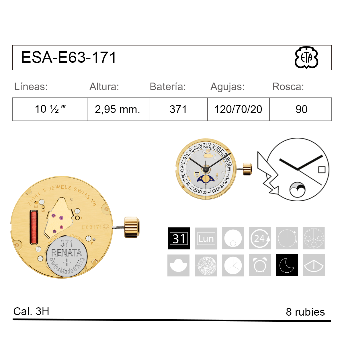 Movimiento Reloj Cuarzo ETA ESA-E63-171 Fase Lunar Calendario 3H. Movimiento de cuarzo Bateria 371 con 8 rubíes Pletina Dorada. Diseño de ESA-E63-171 con tres agujas, calendario a las 3H, fase lunar a las 6H. Producto de excelente calidad, con garantía contrastada que asegura su fiabilidad y durabilidad. Ref ESA-E63-171