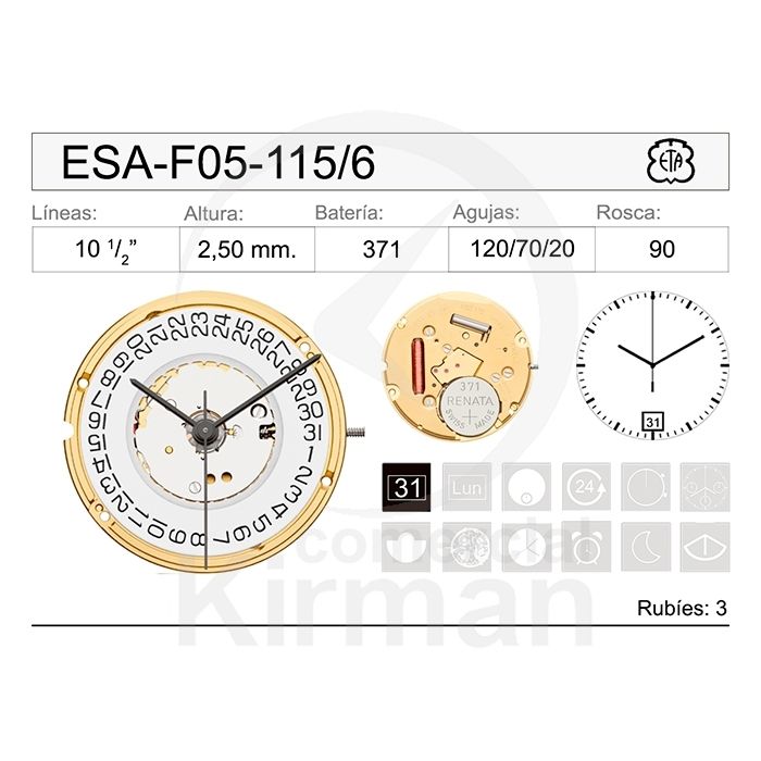 Movimiento Reloj Cuarzo ETA ESA-F05-115/6 Calendario 6H. Movimiento de cuarzo Bateria 371 con 3 rubíes Pletina Dorada. Diseño de ESA-F05-115 con segundero central, calendario a las 6H. Producto de excelente calidad, con garantía contrastada que asegura su fiabilidad y durabilidad. Ref ESA-F05-115/6