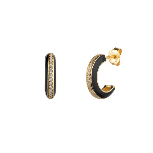 Pendientes Plata Dorada 16mm PEZ1562DOEN Medio Aro Circonitas Enamel Negro