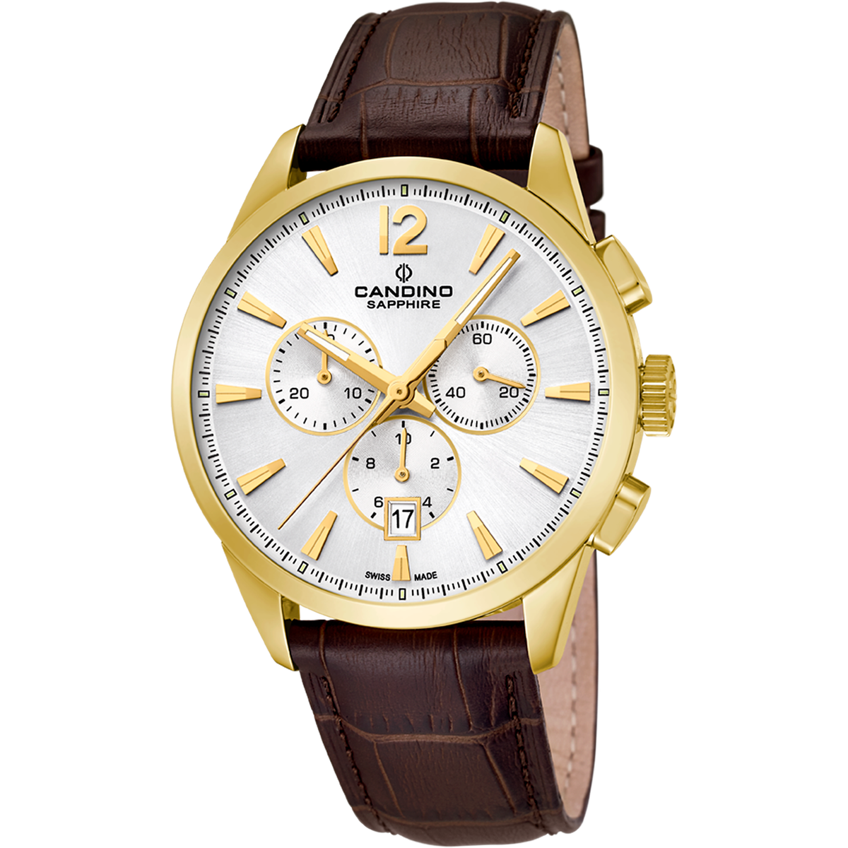 Reloj Candino Hombre C4518/E Piel Marrón Acero Dorado Cronógrafo Analógico. Caja de acero dorado de 42,8mm de diámetro. Bisel dorado. Correa de piel marrón. Cierre hebilla. Esfera plateada. Multifunción, calendario, cronógrafo. Cristal zafiro. Movimiento quartz. Swiss Made. Sumergible 100m. Peso 86,98gr. 3 años de garantía. Ref C4518/E