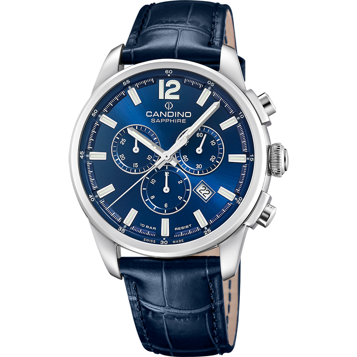 Reloj Candino Hombre C4745/2 Piel Azul Acero Cronógrafo Analógico. Caja de acero de 44mm de diámetro. Bisel plateado. Correa de piel azul. Cierre hebilla. Esfera azul. Multifunción, calendario. Cristal zafiro. Movimiento quartz. Swiss Made. Sumergible 100m. Peso 100gr. 3 años de garantía. Ref C4745/2